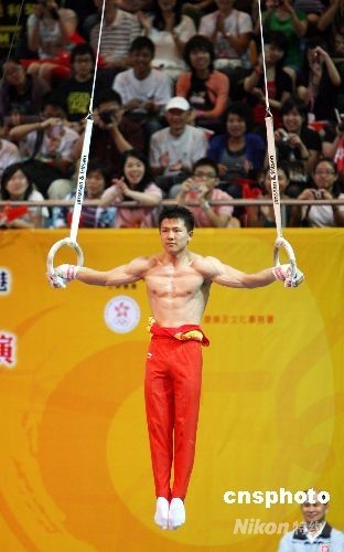 “帥哥”陳一冰首次赤膊上陣,展示吊環(huán)十字支撐動(dòng)作,博得全場觀眾的歡呼和掌聲。中新社發(fā) 洪少葵 攝