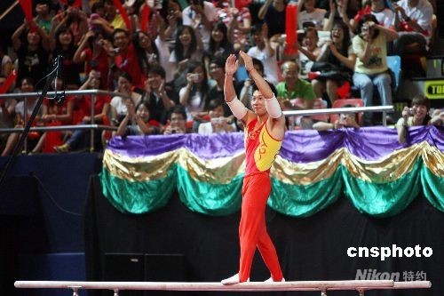 奧運男子雙杠金牌選手李小鵬精彩表演后,站在雙杠上和觀眾招手致意。中新社發 洪少葵 攝