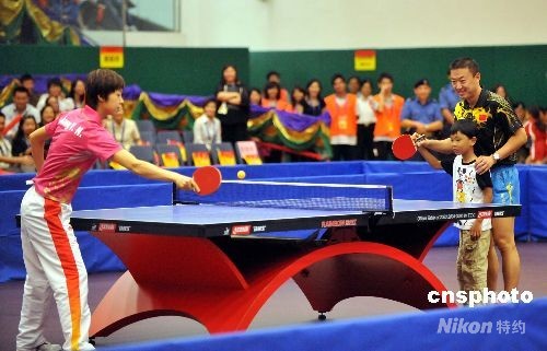 八月三十日,在北京奧運奪得金牌的中國男女乒乓球運動員在香港示范表演,男單金牌得主馬琳指導(dǎo)一位小朋友與女單金牌得主張怡寧砌磋球技。中新社發(fā) 鄧慶樂 攝