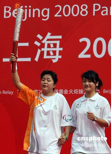九月一日,北京殘奧會火炬接力“時代風采線”第三站傳遞活動,在上海松江新城大學園區進行,共有六十名火炬手參加。其中,殘疾人員10名,其余為助殘、幫殘的先進代表和基層殘疾人事業工作者。圖為上海首枚殘奧會金牌獲得者趙繼紅(左)擔任第一棒火炬手。 中新社發 湯彥俊 攝