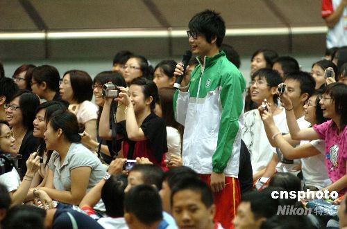 訪問澳門的奧運(yùn)金牌運(yùn)動員代表九月一日上午與澳門青少年真情對話。澳門五十所學(xué)校二千五百名學(xué)生出席對話會。圖為澳門學(xué)生踴躍提問。中新社發(fā) 畢永光 攝