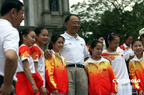 九月一日上午,北京奧運內地金牌運動員代表團在澳門展開第二日訪問行程,代表團團長劉鵬與奧運女子體操團體金牌選手們在澳門著名景點大三巴前留影。中新社發 洪少葵 攝
