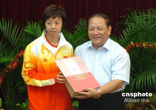 中央駐澳聯(lián)絡(luò)辦九月一日宴請訪問澳門的奧運金牌運動員代表團。圖為中聯(lián)辦主任白志健向運動員代表張怡寧贈送紀(jì)念品。中新社發(fā) 畢永光 攝
