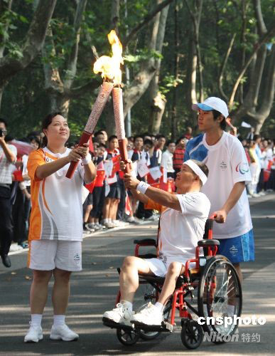 九月二日上午,北京殘奧會圣火來到古都南京,受到民眾的熱烈歡迎,圖為火炬手進行火炬傳遞。中新社發 牛莉 攝