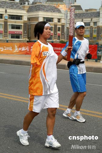 9月3日上午9時30分,以“超越、融合、共享”為主題和“點燃激情,奉獻關(guān)愛”為口號的北京殘奧會火炬,開始在中國北方美麗的海濱城市大連傳遞。圖為殘疾人火炬手傳遞火炬。中新社發(fā) 宋太盛 攝