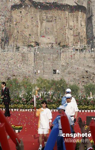 9月4日,火炬手在最具洛陽特色的城市名片--世界文化遺產(chǎn)龍門石窟景區(qū)內(nèi)傳遞殘奧會火炬。當(dāng)日,北京2008殘奧會火炬在千年帝都、牡丹花城洛陽傳遞,有65名火炬手參加傳遞。北京2008殘奧會火炬?zhèn)鬟f共有兩條線路,一是“時代風(fēng)采線”,二是“中華文明線”,洛陽是“中華文明線”5個殘奧會火炬?zhèn)鬟f城市之一,也是進(jìn)入北京前的最后一個傳遞城市。9月5日兩路火炬將在北京匯合,9月6日晚在殘奧會開幕式主會場點(diǎn)燃主火炬。中新社發(fā) 張曉理 攝