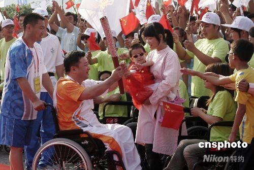9月4日, 火炬手在最具洛陽(yáng)特色的城市名片——世界文化遺產(chǎn)龍門石窟景區(qū)內(nèi)傳遞殘奧會(huì)火炬。當(dāng)日,北京2008殘奧會(huì)火炬在千年帝都、牡丹花城洛陽(yáng)傳遞,這是火炬進(jìn)京前最后一站,共有65名火炬手參加。中新社發(fā) 張曉理 攝