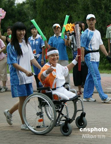9月6日,殘奧會火炬結束在北京的傳遞,參加火炬?zhèn)鬟f的殘疾人占火炬手五分之一。中外殘疾人火炬手在傳遞中成了亮麗的風景線,沿途觀眾為他們喝彩加油。 中新社發(fā) 馬毅行 攝