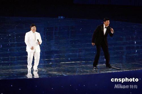9月6日晚,北京2008年殘奧會開幕式在國家體育場“鳥巢”舉行,圖為歌手劉德華(右)、韓紅在開幕式上演唱殘奧會主題歌《和夢一起飛》。 中新社發 盛佳鵬 攝