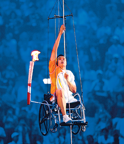 9月6日晚,“鳥巢”再次成為全球的焦點(diǎn)。殘疾人田徑運(yùn)動(dòng)員侯斌以震撼世界的方式,點(diǎn)燃了北京2008年殘奧會(huì)主火炬:他坐在輪椅上,將火炬安置在輪椅的火炬支架上,獨(dú)自拉緊繩索,牽動(dòng)著自己和所乘坐的輪椅緩緩向上攀升,用雙手完成了向主火炬的“攀登”。殘奧會(huì)主火炬點(diǎn)燃的一剎那,全場(chǎng)沸騰了……