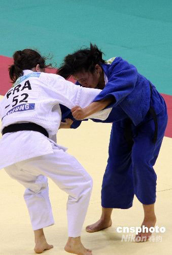 9月7日,在北京殘奧會(huì)盲人柔道女子52公斤級(jí)的決賽中,中國(guó)選手崔娜(藍(lán)衣)擊敗法國(guó)選手桑德里娜·奧里埃·馬蒂內(nèi),獲得金牌。中新社發(fā) 王韶驊 攝