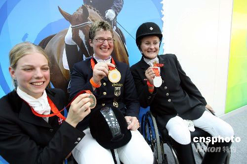 九月八日上午,德國選手布麗塔·納佩爾(中)在香港奪得北京殘奧會馬術比賽個人錦標賽科目級別Ⅱ冠軍,摘取殘奧會馬術比賽首金,加拿大選手勞倫·巴威克(右)獲得銀牌,丹麥選手卡羅琳·尼爾森獲銅牌。中新社發 洪少葵 攝