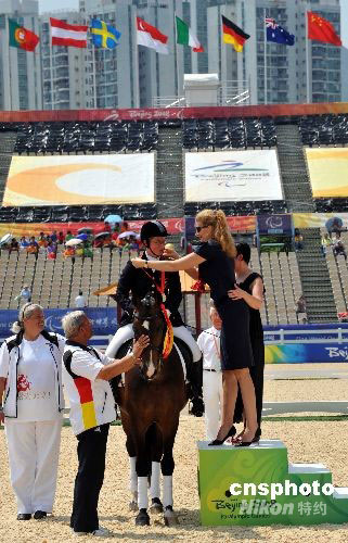九月八日上午,德國選手布麗塔·納佩爾先聲奪人,在香港奪得北京殘奧會馬術比賽個人錦標賽科目級別Ⅱ冠軍,摘取殘奧會馬術比賽首面金牌。中新社發 鄧慶樂 攝