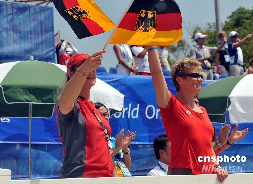 圖為德國隊“粉絲”揮舞國旗為參賽選手助威。
