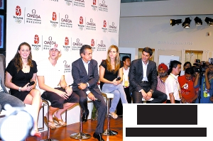 菲爾普斯(左二)到歐米茄展區參加活動,隨衛隊員在一旁警衛