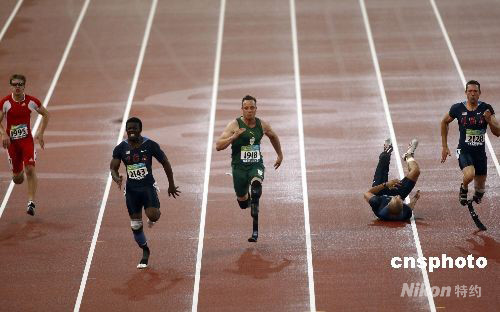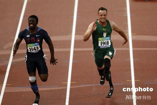 9月9日,北京殘奧會(huì)男子100米-T44決賽中,被稱(chēng)為“刀鋒戰(zhàn)士”的南非選手皮斯特瑞斯以11秒17的成績(jī)摘得金牌。 中新社發(fā) 杜洋 攝