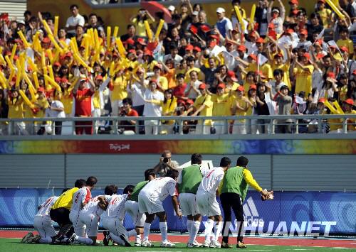 終場哨音響起,他們集體跑向北側邊線,彼此手搭肩頭站成橫排,然后雙膝跪地,向看臺上為他們加油的中國觀眾表達感激之情。意外的舉動,令現場觀眾先是一愣,隨即報以更熱烈的掌聲與吶喊。