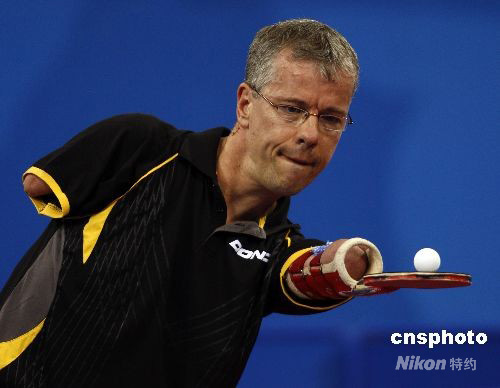 9月11日,北京殘奧會乒乓球男子M6比賽中,德國無手選手萊納-施密特獲得第四名。 中新社發 杜洋 攝