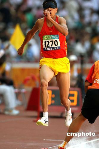 9月12日,北京殘奧會田徑比賽繼續(xù)在北京奧林匹克公園內(nèi)的國家體育場-鳥巢舉行,30歲的中國選手李端在上午進(jìn)行的男子三級跳遠(yuǎn)-F11級別的比賽中以13.33米的成績獲得冠軍并打破殘奧會紀(jì)錄。盲人三級跳遠(yuǎn)比賽是殘奧會田徑比賽中非常有特色的一項(xiàng),全盲的選手依靠教練在起跑區(qū)發(fā)出的聲音助跑起跳。