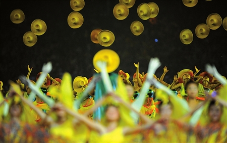 “歡慶篇章”是整臺(tái)晚會(huì)“寄給未來(lái)的一封信”的壓軸戲,而“草帽舞”是“歡慶”中的高潮部分、晚會(huì)的亮點(diǎn)之一。昨晚草帽舞華麗登場(chǎng)時(shí),成都的姑娘們從舞臺(tái)的左臺(tái)口向舞臺(tái)的右底角走“斜線一字”,動(dòng)作整齊,節(jié)奏分明,邊行進(jìn)邊傳遞草帽,她們的隊(duì)列沉穩(wěn)舒緩,時(shí)圓時(shí)方,變化萬(wàn)千。到達(dá)鳥巢中間時(shí),草帽突然像金色的花朵,從演員手中快速飛出,在空中彼此飛舞,宛如向日葵花簇簇綻放,蔚為壯觀。而在草帽舞隊(duì)的四周,還有兩千多人輔以奔放灑脫的舞蹈表演。此時(shí)鳥巢內(nèi)已是掌聲雷動(dòng),歡呼陣陣。整個(gè)節(jié)目傳遞的是青春、是快樂(lè),是少女的激情與奔放,是自由與陽(yáng)光,是未來(lái)的希望,表演服飾也以紅黃為主調(diào),大紅艷麗,大黃成熟,直奔?xì)g慶主題。成都的姑娘們退場(chǎng)后激動(dòng)地說(shuō),她們的自信和當(dāng)晚的演出成功,離不開(kāi)奧組委領(lǐng)導(dǎo)的關(guān)心支持。據(jù)悉,這批專業(yè)演員全部由成都市文化藝術(shù)學(xué)校的專業(yè)舞蹈學(xué)生、演員和舞蹈教師組成。(周帥)