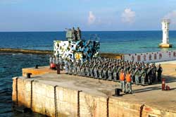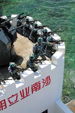 赤瓜礁附近海面,游弋著我海軍執(zhí)行戰(zhàn)斗值班任務(wù)的導(dǎo)彈護(hù)衛(wèi)艦。在遙遠(yuǎn)的南海看到自己的戰(zhàn)艦,大家都很激動。老實(shí)說,中華民族的和平發(fā)展是任何人也不能阻擋的。作為祖先留給我們的一筆大遺產(chǎn),南沙理應(yīng)成為我們由陸地向海洋、由淺藍(lán)向深藍(lán)進(jìn)行戰(zhàn)略發(fā)展的一個大空間。隨著人們對海洋的認(rèn)識不斷深化,隨著人類對海洋資源開發(fā)利用的能力不斷提高,南沙的戰(zhàn)略價值正日益凸顯。每次與南沙衛(wèi)士座談,他們都呼吁,強(qiáng)化海洋意識、海權(quán)意識、海軍意識,正當(dāng)其時。
