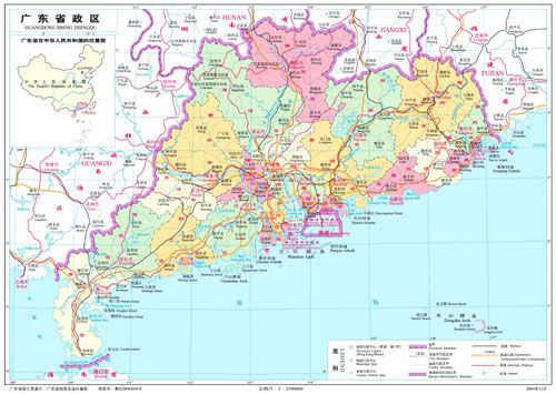 廣東位于中國大陸最南部,南臨南海,海岸線總長3368公里,島嶼眾多。地勢北高南低,境內山地、平原、丘陵交錯。河流大多自北向南流,主要有珠江、韓江、鑒江等。最長的珠江由西江、北江、東江匯流而成,長2122公里,是中國第三大河流。南海沿岸的珠江三角洲、韓江三角洲土地肥沃,是著名的魚米之鄉。