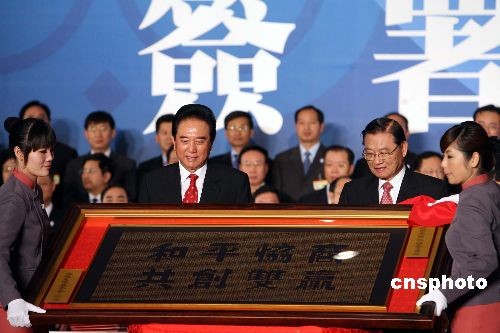 ·圖:江丙坤贈陳云林"和平協商 共創雙贏"匾額