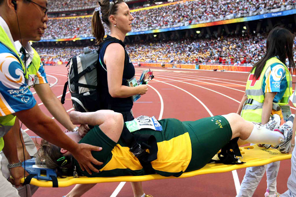 殘奧會(huì)進(jìn)入第6個(gè)比賽日,產(chǎn)生了54枚金牌。在這一天里,金牌主要擊中在田徑、游泳和公路自行車三個(gè)大項(xiàng)上。田徑和游泳依然是產(chǎn)生金牌的“大戶”,各自決出18和16個(gè)冠軍。在“鳥巢”進(jìn)行的比賽里,女子5000米T54級(jí)決賽因?yàn)樽曹嚩刭悾谀凶尤?jí)跳遠(yuǎn)F11級(jí)決賽里,雅典殘奧會(huì)兩金得主中國(guó)盲人跳遠(yuǎn)名將李端打破世界紀(jì)錄為中國(guó)代表團(tuán)再添一金。