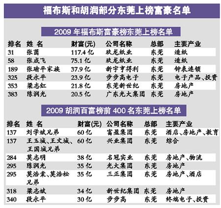 2009福布斯中國富豪榜昨日(11月5日)發布。記者從榜單上獲悉,福布斯富豪榜上王傳福以396億元位列第一,其中公司總部在東莞的上榜富豪有6位,張茵以財富117.4億元排名東莞第一,在整個2009福布斯中國富豪榜上排名第31位,其弟弟張成飛則緊追其后排名東莞第2。