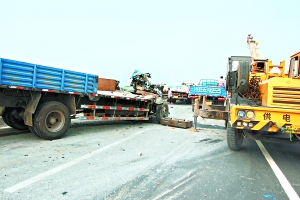 上午8時,記者趕到現場時,飲鹿池橋雙向仍有些擁堵。貨車事故發生在東向西最內側車道上,一輛吊車正在把從事故車上分離出來的零件吊到其他貨車上運走,外側只有一條車道可供通行。而西向東的撞人現場已基本清理完畢,交通逐漸恢復。