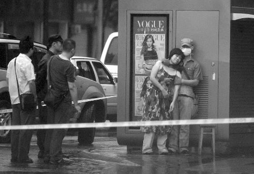 歹徒背靠書報亭,站在屋檐下,右手持刀抵住女人質的脖子,左手牢牢拽住后者的手臂。警方隨即在現場拉起警戒線,為避免刺激歹徒的情緒,又及時疏散了圍觀的群眾。