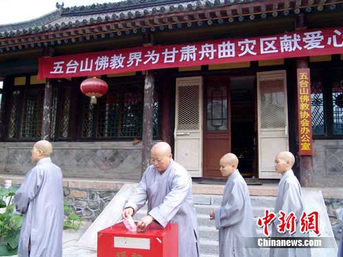 當(dāng)甘肅舟曲泥石流災(zāi)害的消息傳到五臺山時(shí),再次揪疼了五臺山僧眾的心。為幫助受災(zāi)群眾順利重建家園,身在佛門心系天下蒼生的他們,不論是黃廟的,還是青廟的,不論貧富,不分遠(yuǎn)近的大大小小的40多處寺廟和近千個(gè)四眾弟子,以同樣真切和濟(jì)世之情,共同援手,在不到一個(gè)小時(shí)的時(shí)間里,捐款數(shù)達(dá)到了53.6380萬元人民幣,其中普壽寺捐款10萬元,萬佛閣6萬元,塔院寺5.5萬元、普化寺5萬元,其它寺院均盡自己的力量出資捐助。目前,善款已轉(zhuǎn)交有關(guān)部門,但捐款活動仍在繼續(xù)進(jìn)行。
