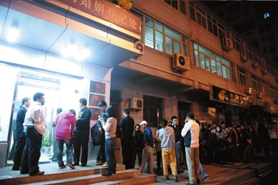昨天凌晨5點(diǎn)多,海淀區(qū)婚登處門外已經(jīng)排起了近100米的長隊(duì)。排隊(duì)的人幾乎都是一對(duì)對(duì),但排在第一位的卻只有一個(gè)人,是一名姓胡的中年男子。