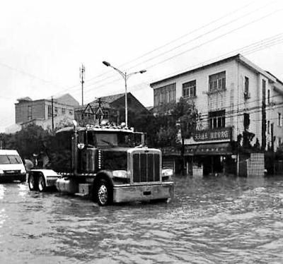 8日深夜,余姚市中心水深沒腰,道路一片漆黑。汪洋之中,一臺(tái)碩大的重型卡車喘著粗氣,在深水中往返救援。撕開夜幕的車燈光,給一些被大水圍困了兩天的群眾帶來了希望。