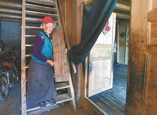 10月14日中午,松潘縣毛爾蓋上八寨鄉克藏村,80歲的仁青卓瑪坐在火爐旁,高原上的陽光透過窗戶照在她手里的木板上。
