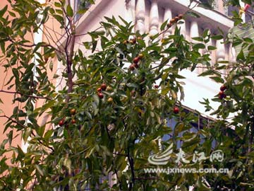 棗樹一年為什么會出現(xiàn)兩熟現(xiàn)象,有專家分析說,這可能和棗樹品種變異有關(guān),也有可能是近兩年秋季光照充足造成的。(記者徐黎明、厲麗攝影)