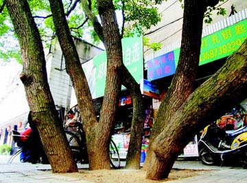 同一條根,6個主枝,在芙蓉中路三段145號一家店鋪前有這樣一棵罕見的“6胞胎”樟樹。其中最粗的160厘米,最細的也有80厘米,通高21米,樹冠面積70—80平方米。