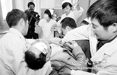 28日下午,幾年前被評為南昌市“十大文明之星”之一的78歲老人沈偉華在老福山立交橋下制止一“破爛王”打鑼發出噪音時,竟遭兩個20多歲的年輕男子譏笑為“多管閑事”,雙方發生爭執后,一名男子掄起拳頭就朝沈老臉上砸去,隨后就是一頓猛打,幾分鐘后,兩男子揚長而去。路人報警后,沈老被送進醫院。據介紹,沈老頭部及腰背部多處軟組織挫傷。目前,繩金塔派出所正在調查。圖為醫護人員正在搶救。 (記者 肖佩佩 王辰/圖)