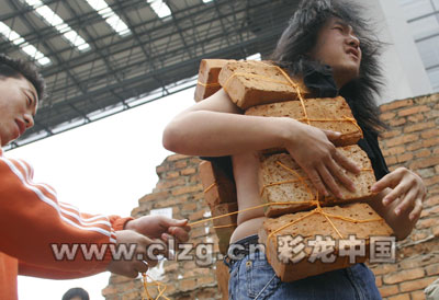 特殊的氣氛讓路過的學生和市民紛紛停住了腳步。10點30分,王軍在朋友的幫助下開始“裝備”。他脫去上衣,將一件黑T恤裹在脖子上,肩膀上掛上了26塊磚——每塊重約2斤,一時間,悠閑的表情變成了“臉紅脖子粗”。拖上一個裝了20塊磚的行李箱,王軍深呼了一口氣,走入云南藝術學院,準備穿過校園,經西站沿西昌路、昆紡,抵達目的地昆明火車站。
