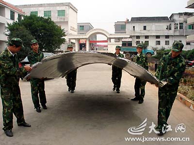 因天氣原因,直至30日下午,飄落于全南縣深山的運載“嫦娥一號”衛星的長征三號甲火箭整流罩殘骸,在該縣人武部人員的護送下運往有關部門。記者獲悉后,獨家對此進行了采訪。
