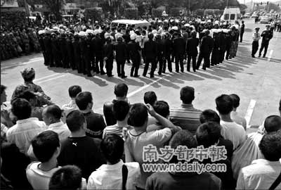 現場一片緊張的氣氛。20多名男女聚集在蘿崗區宏明路16號門口,面紅耳赤地吼叫著。他們旁邊是一輛保險杠和雨刮都不知去向的面包車,窗前支著一塊“運政稽查”紅色牌子;他們身旁是由特警、民警、輔警和治安隊員百余人組成的一道封鎖線和約250平方米的封鎖區,封鎖線旁則是數百圍觀的群眾。