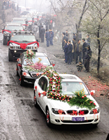 上午十點左右,迎親車隊出發。婚車車隊在路上排起了長龍,其中有12輛悍馬,龍鳳彩車走在最前面。據一位司機講,每輛彩車的裝修費用都高達6萬元。彩車因為經過外部裝修視野不好,有專門的工作人員手持彩旗引導。