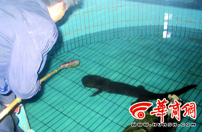 今年,漢中賓館破產拆遷,賓館和漢臺區旅游局的人將巨型娃娃魚寄養到了興元湖公園的動物園。動物園專門為它準備了一個水池,并進行了消毒和水質檢測。這條娃娃魚據估計已有40多歲,目前身體健康。(記者 衛曉寧)