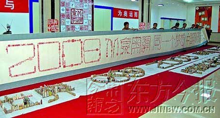 曹歡介紹,這些字體有甲骨文、漢簡、隸書、大篆、小篆等,刻的內容為《孫子兵法》全文和孫武生平簡介以及中國印與北京奧運之緊密關系等內容。這些印章共有2008枚,寓意2008年北京奧運會。這些印章已拓在了兩幅長卷上。兩幅長卷的長度都為29米,寓意第29屆北京奧運會,寬度為1.3米,寓意第13屆北京殘奧會。一幅形狀是“北京2008”,另一幅是“同一個世界、同一個夢想”。