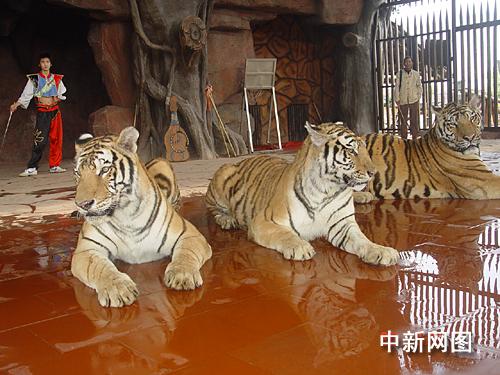 中新網順德11月22日電(孫建駒 謝俊忠)陜西省鎮坪縣農民周正龍拍攝華南虎一事經媒體廣泛傳播后,一時坊間沸沸揚揚,并引發“打虎派”和“挺虎派”的熱烈爭論,互聯網上更是“打虎”聲一片。在真假華南虎熱爭之際,廣東順德長鹿休閑度假農莊馬戲團將3只東北虎的照片制成大小一樣的噴畫,準備邀請網友與周正龍前來順德拍虎,然后比較真虎照與噴畫虎照的區別所在。
