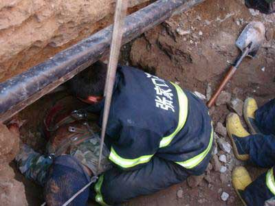 接到報警的張家口市公安消防支隊橋東大隊特勤中隊的官兵迅速趕到現場。從目擊者處了解的情況是,塌方時有5名施工人員正在一坑道內進行挖掘作業,全部被埋在下面。其中三人被埋的深度較淺,兩人較深,土層厚度約有兩米。