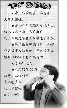在江蘇省常州市新北區某科技園的一家公司,僅僅六七十平方米的辦公場所,聚集了一批所謂的“股神”。每天,這里的幾十個“業務員”頻繁地給全國各地的股民打著電話,聲稱他們是能隨時得到股市“黑馬信息”的神奇點金人,股民只要交納投入股市資金量5%至10%的會員費,就可以得到這些信息,在兩三個月中賺50%甚至翻上一番。