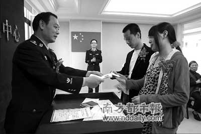 在得知女友懷上了孖仔后,為了給即將出生的兩個寶寶一個合法的身份,中山市看守所內(nèi)的服刑人員袁某提出要與女友結(jié)婚。看守所所長證婚,婚禮現(xiàn)場的布置由看守所的民警一手張羅。11月21日,袁某與女友如愿在中山市婚姻登記中心登記成為合法夫妻,成為中山市首個登記結(jié)婚的服刑人員。