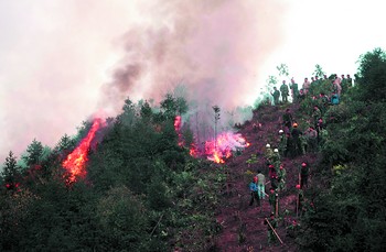 昨日上午9時許,大風讓火勢再次蔓延。此時,600多名增援的武警、消防戰士、民兵預備役戰士迅速投入到山火的撲救之中。寬25米、長1公里的隔離帶剛剛砍伐成功,迅猛的火勢立即就蔓延過來。到上午11時,4條隔離帶相繼失守。常規的山火撲救方法已經無法奏效,只得重新布置兵力。20米的隔離帶被拓寬到了25米,三組人員同時展開戰斗。記者在現場看到,附近許多村民已將自家的電視機、桌子、衣被等物什全部搬至空曠地。