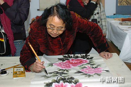 中新網11月28日電 今天下午,“第五屆網上河北行(邯鄲)”網絡媒體采風團來到邯鄲市邯山區渚河路街農林二社區居民中心參觀。在才藝展示廳內,展柜上一件件精美小巧的自制手工藝品吸引了眾人的目光,紛紛向制作者請教制作過程。而一幅正在繪畫當中的牡丹圖,嬌艷欲滴,記者紛紛拍照留念。